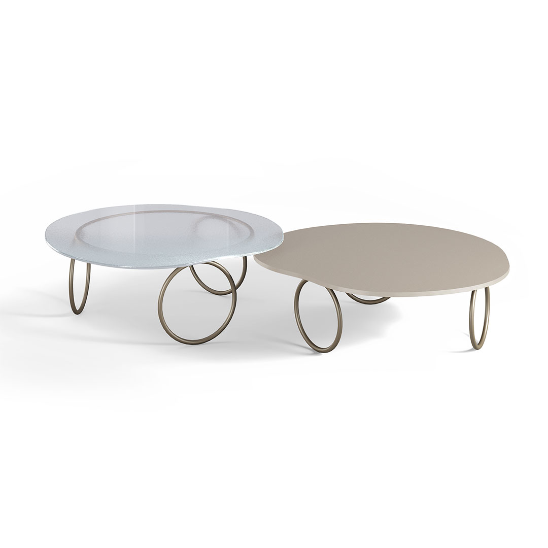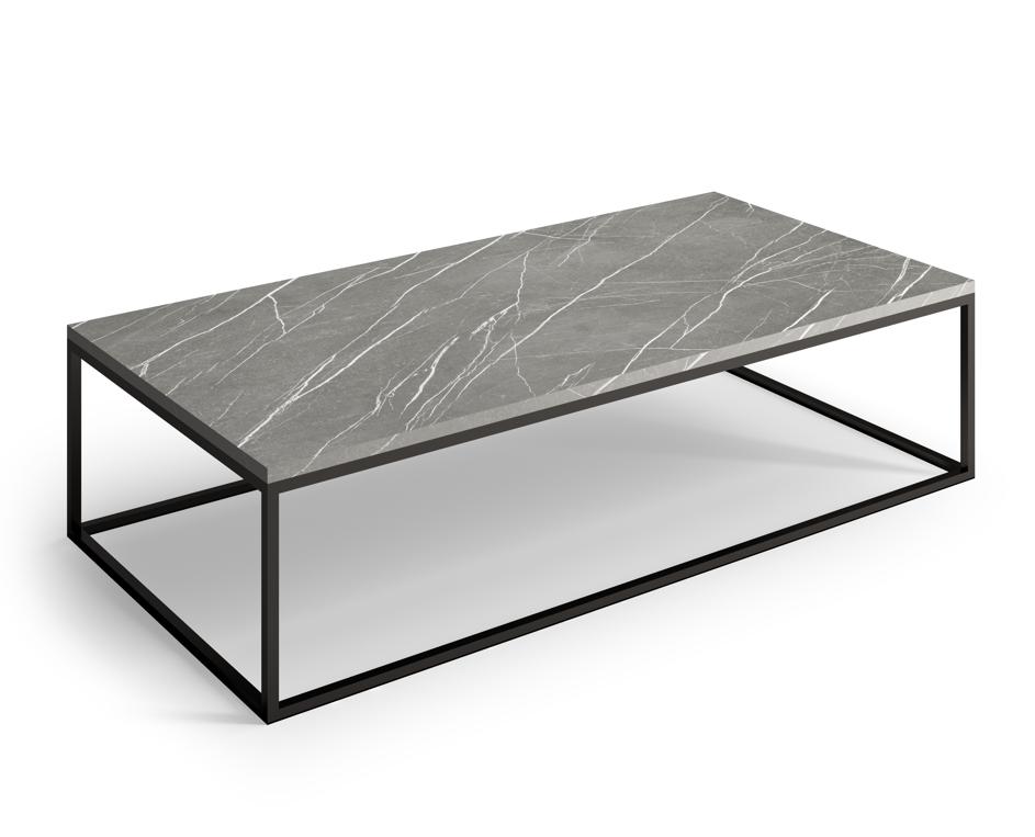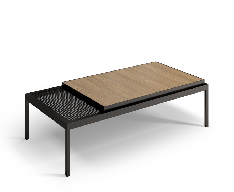 O Conjunto Mesa de Centro Boreal tem uma base quadrada fechada em metal com os cantos arredondados, conta com um conjunto de duas peças com tampos retangulares arredondados e alturas diferentes. (Produto montado)